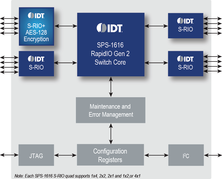 The IDT SPS-1616 Security Enabled Serial RapidIO Gen2 switch is designed for systems that need RapidIO links to go from chassis to chassis with out-of the-box cabling requiring secure/encrypted packets. Using AES-128 encryption the SPS-1616 allows Wireless 基础设施 design engineers to create scalable, stackable systems with up to 20 Gbps between chassis, without having to use expensive encryption cable processors that induce 高 latency due to software involvement. With the SPS-1616 the security 要求 for LTE can be met, while keeping up with line rate between chassis. The SPS-1616 特征 one quad with Security Capability with the 其他 three quads 支持ing standard RapidIO only for inside-the-box links.